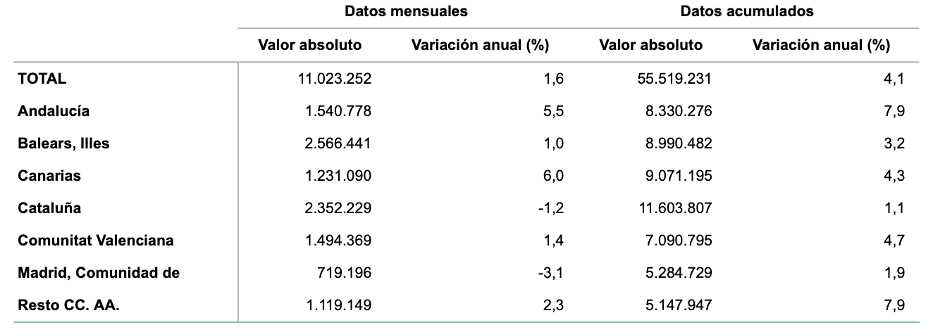 Destinos: Illes Balears recibió 2,57 millones (+1,0%), Cataluña 2,35 millones (-1,2%) y Andalucía 1,54 millones (+5,5%).
