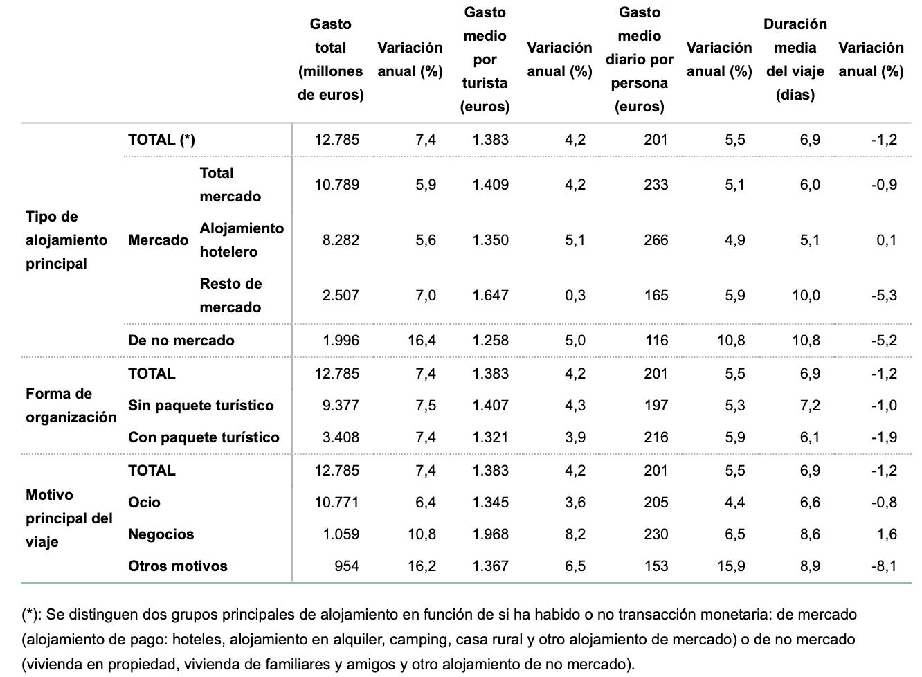 La Encuesta de Gasto Turístico (EGATUR) de octubre de 2025 refleja que el gasto total de los turistas internacionales alcanzó los 12.785 millones de euros, un 7,4% más que en 2024. El gasto medio diario subió a 201 euros (+5,5%) y el gasto medio por turista llegó a 1.383 euros (+4,2%). En los 10 primeros meses, el gasto acumulado ascendió a 118.612 millones (+7%).